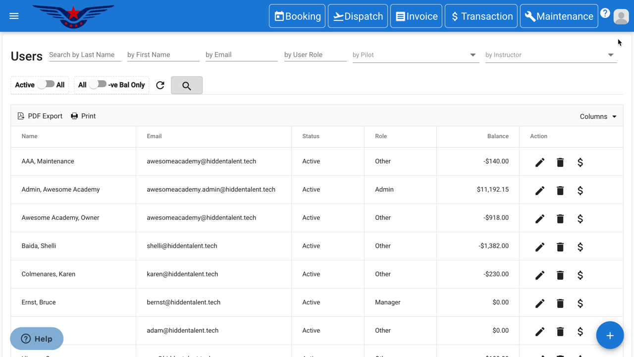 Create or edit the instructors with ease. Manage instructor’s medical dates, CFI Rates and license, etc. from one place. Search for the instructors and easily activate/inactive them. Print or export the reports in PDF.